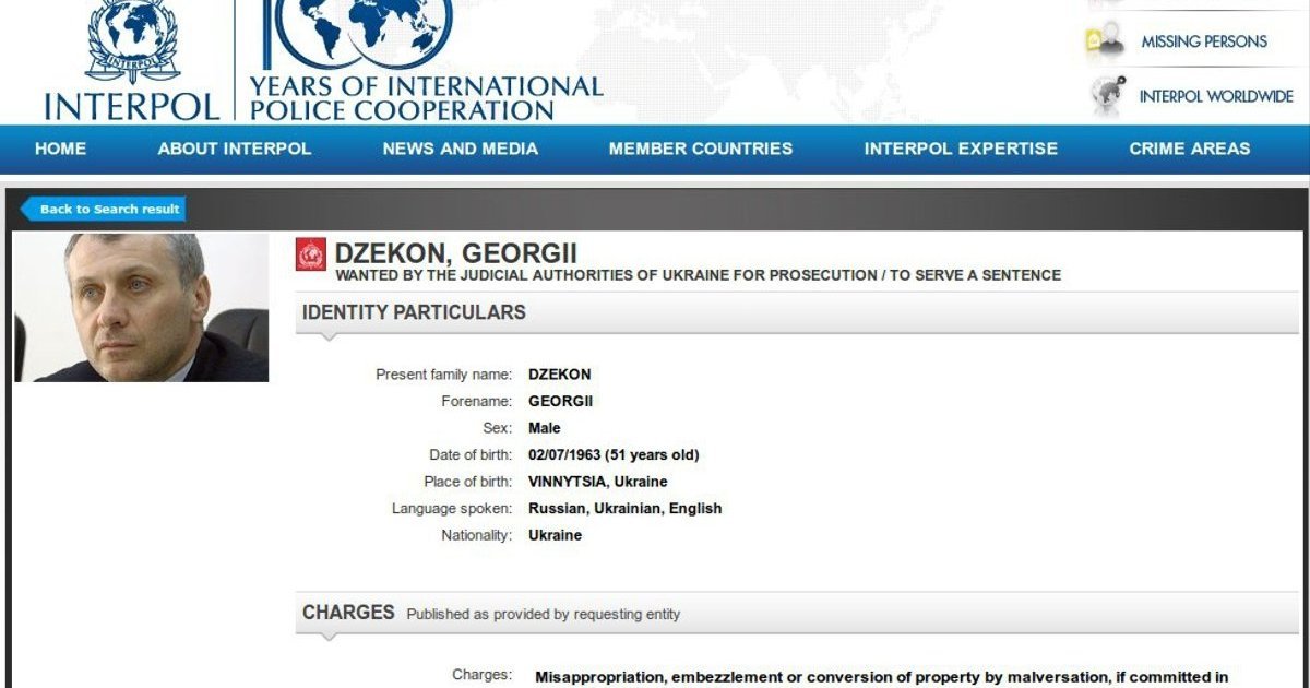 12 января 2015 года Интерпол сообщил, что по обращению украинских властей в международный розыск для задержания и экстрадиции в Украину объявлены экс-президент Виктор Янукович, экс-премьер Николай Азаров, экс-министр финансов Юрий Колобов и экс-глава правления "Укртелекома" Георгий Дзекон. Украинские СМИ тогда распространили об этом сообщения со скриншотами с сайта Интерпола. В том числе и с фотографиями Дзекона.