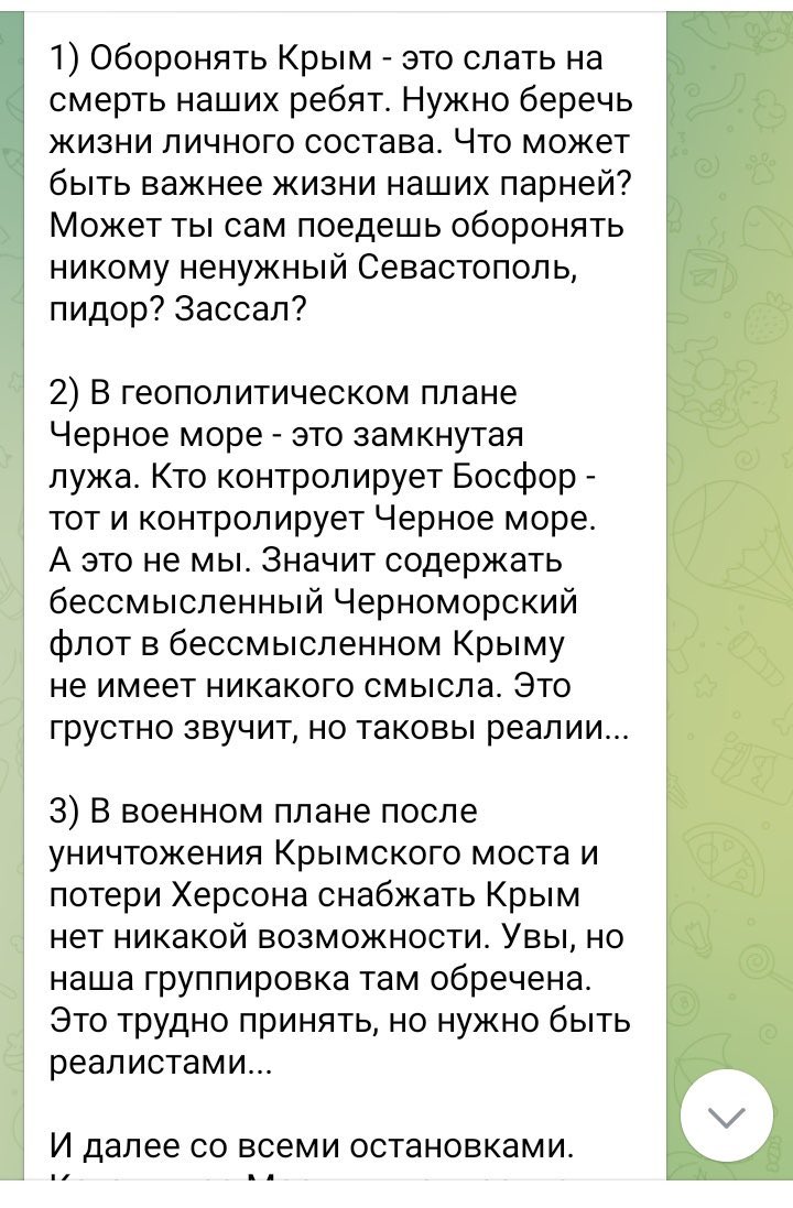 Они могут начать рассказывать на российских пропагандистских передачах, что весь запад втянулся за Украину, и что воевать против всего коллетиваного запада они не могут. Им сейчас лишь бы Запад не зашел на территорию россии! "Военные запада воюют за Украину, британцы, американцы, поляки! Запад поставляет Украине современное вооружение тоннами! Не возможно выиграть войну у всего запада, который это 50% мирового ВВП! А россия 1% мирового ВВП! Воевать против противника, который в 50 раз сильнее - это зря туда наших ребят посылать на кровавую мясорубку. Что мы можем сделать? Послать на америку 1000 ядерных ракет? Так она сразу пришлет в ответ 1000 ракет! Нужно идти на сделку с Западом и выводить войска со всей международно-признанной территории Украины. И добиваться отмены санкций.".