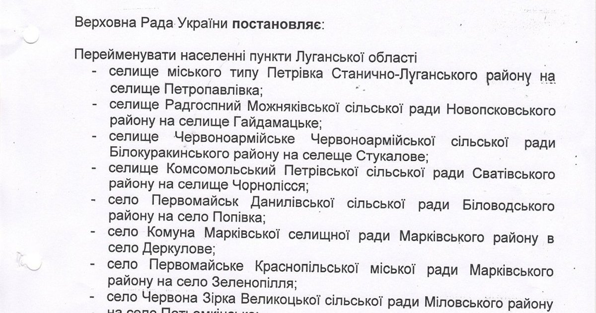 В мае экспертная комиссия провела исследовательскую работу и пришла к выводу, которые выложила в проекте постановления Верховной Рады о переименовании населенных пунктов Луганской области. Согласно проекту, всего на контролируемой Украиной территории области предстоит переименовать 19 населенных пунктов, названных в честь деятелей коммунистического режима", - говорится в сообщении.