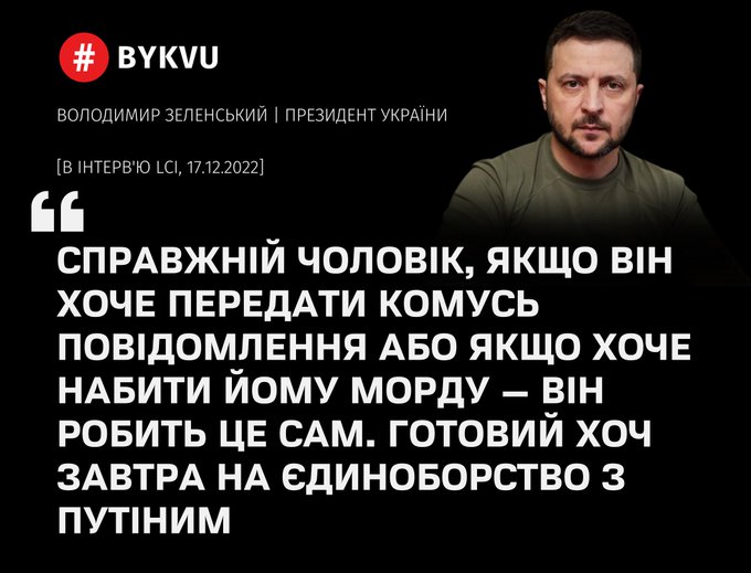 "Если Путин хочет применить ядерное оружие, он его применит. Так же, как он обещал Макрону, Меркель - всем, что полномасштабного вторжения в Украину не будет... Просто нельзя верить людям, которые что-то говорят, а действуют так, как решили лично они... Он действует, как выгодно ему, не Российской Федерации....Поэтому использование любого оружия зависит только от прочности объединения Украины с Европой, США, всем миром. И когда он увидит эту прочность, он ничего не будет использовать", – считает Зеленский.
