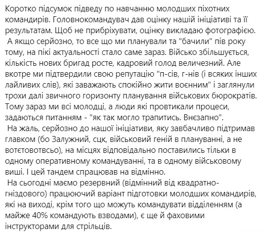 1. Коротко підсумок підведу по навчанню молодших піхотних командирів. Головнокомандувач дав оцінку нашій ініціативі та її результатам. Щоб не прибріхувати, оцінку викладаю фотографією. А якщо серйозно, то все що ми планували та "бачили" пів року тому, на пікі актуальності стало