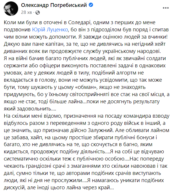 Це сам Юрій написав у профілі фб "Стрілок батальйону ТРО З 21 лютого 2022 р. дотепер".
