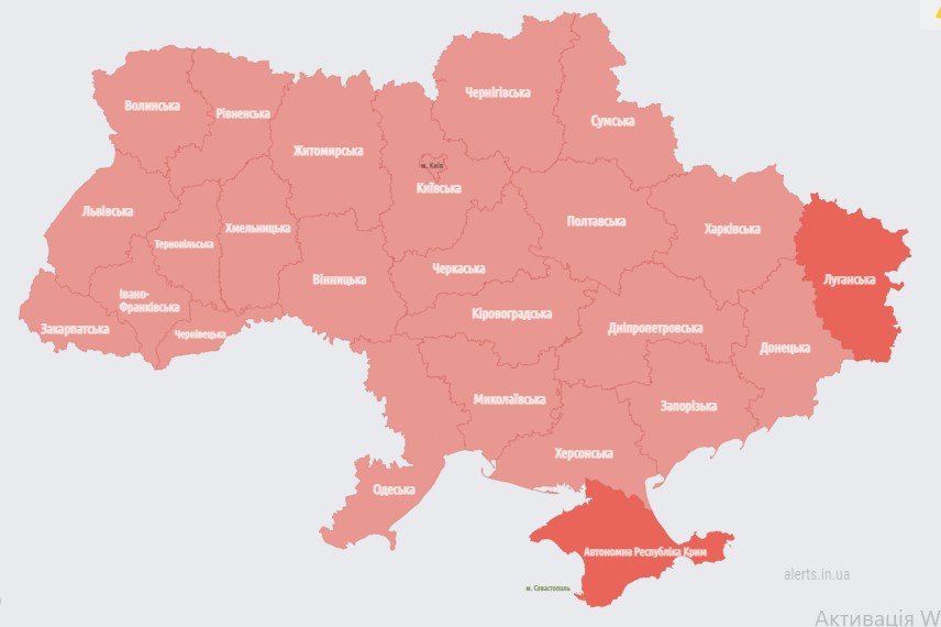 По состоянию на 13:32 воздушную тревогу отменили во всех областях, кроме Луганской и АР Крым.