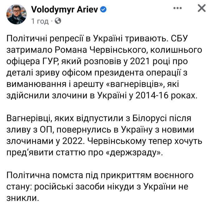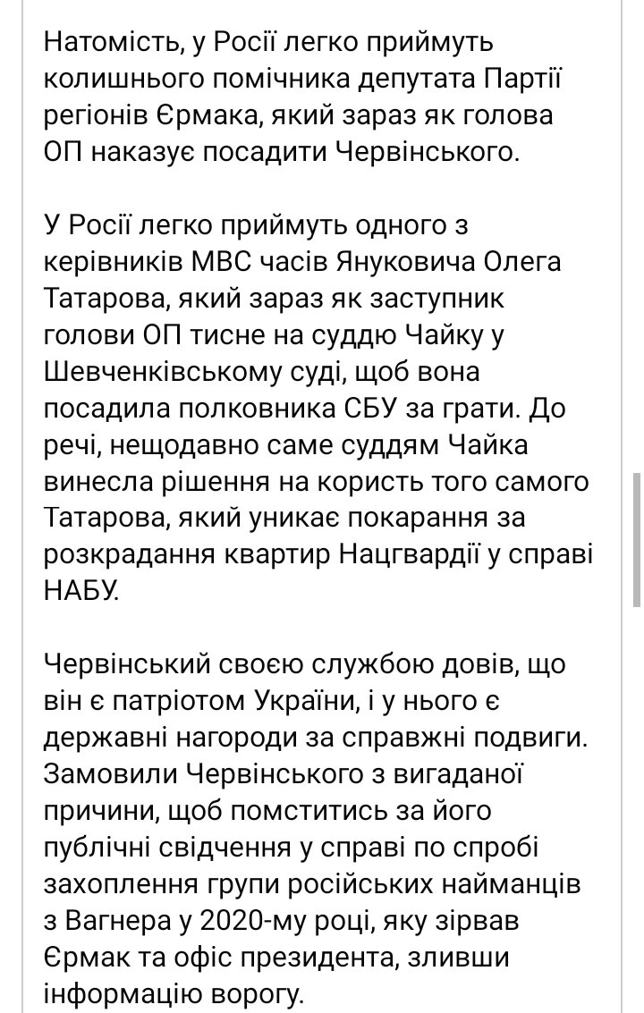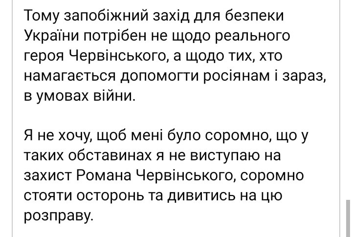 "Только что подал заявление о желании взять на поруки полковника Романа Червинского, сотрудника СБУ и ГУР, заслуженного героя войны за независимость Украины. Россияне могут сегодня радоваться - Роман Червинский, непосредственно причастный к ликвидации целого ряда российских командиров, в том числе "Моторолы " и "Гиви", заводится в наручниках в зал суда по вымышленному правонарушению", - отмечает он.