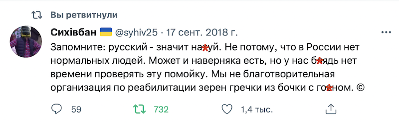 24 жовтня 1942 року в газеті «Красная звезда» з'явилася знаменита стаття письменника й публіциста, киянана за народженням, Іллі Еренбурга «Убей!». У якій рефреном повторювалося, як заклинання, до всіх воїнів - «Убей немца!». Гітлер через це оголосив Еренбурга своїм особистим ворогом. Згодом Еренбургові часто дорікали за його пропаганду ненависті до німців, а в повоєнні часи ця стаття в СРСР взагалі ніде не публікувалася. У мирний час її би просто не зрозуміли. Але зараз, у розпал війни, після того як ми побачили що ті нелюди ро*** на нашій благословенній землі, нам зрозуміло, що мав відчувати Ілля Григорович у 1942-му. Беремо статтю Еренбурга «Убей» мовою оригіналу. І змінюємо «немца» на «русского». «Русскій» - в даному конкретному випадку - це всі орки, що прийшли на нашу святу землю, включно із бурятами, кадировцями та іншим біосміттям. «Мы знаем все. Мы помним все. Мы поняли: русские не люди. Отныне слово "русский" для нас самое страшное проклятье. Отныне слово "русский" разряжает ружье. Не будем говорить. Не будем возмущаться. Будем убивать. Если ты не убил за день хотя бы одного русского, твой день пропал. Если ты думаешь, что за тебя русского убьет твой сосед, ты не понял угрозы. Если ты не убьешь русского, русский убьет тебя. Он возьмет твоих и будет мучить их в своей окаянной России. Если ты не можешь убить русского пулей, убей русского ножом. Если на твоем участке затишье, если ты ждешь боя, убей русского до боя. Если ты оставишь русского жить, русский повесит украинца и опозорит украинскую женщину. Если ты убил одного русского, убей другого - нет для нас ничего веселее русских трупов. Не считай дней. Не считай верст. Считай одно: убитых тобою русских. Убей русского! - это просит старуха-мать. Убей русского! - это молит тебя изнасилованная женщина на глазах которой насиловали её дитя. Убей русского! - это кричит родная земля. Не промахнись. Не пропусти. ВБИЙ !!!!!!!!!!!!!!!!!!!!