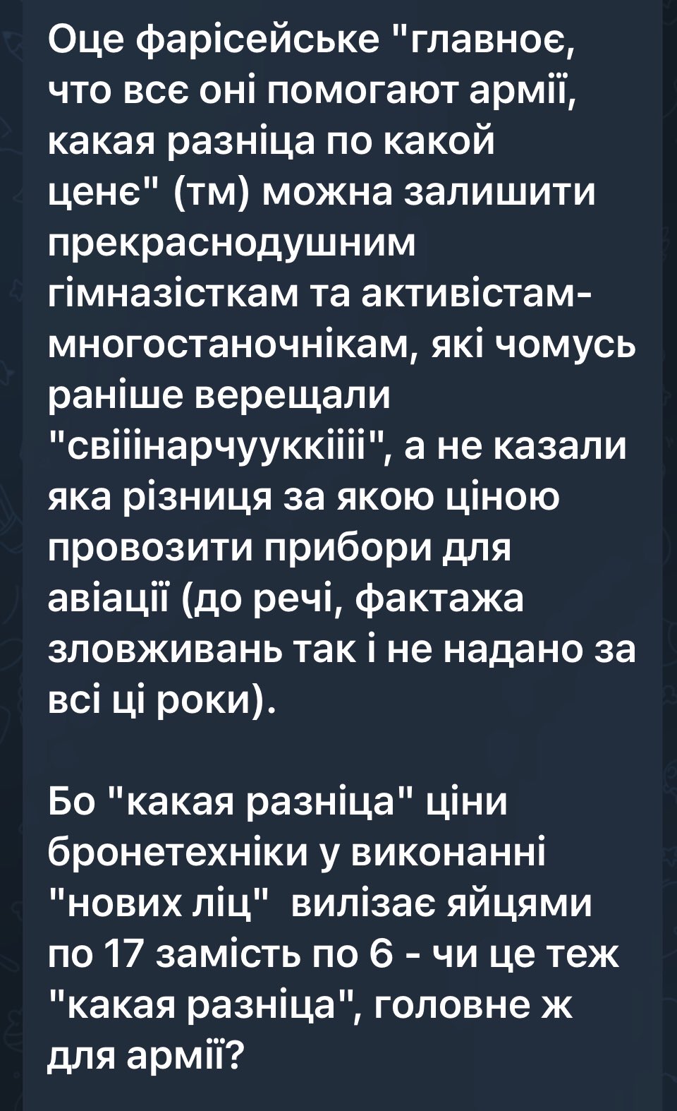 Ти розумна адекватна (нехай зайве совістлива) людина, тому можеш самостійно відповісти на ці риторичні запитання; а також заодно на те, чому нині Пороху потрібен піар, тим більше, його добрих богоугодних справ.