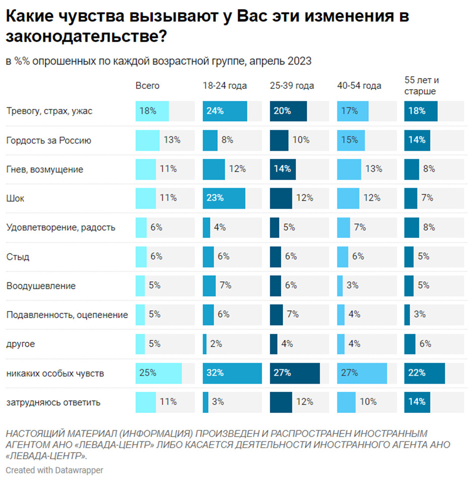 Преобладающими чувствами, вызванными данными изменениями в законодательстве, являются "тревога, страх, ужас" (18%), "гордость за Россию" (13%), а также "гнев, возмущение" и "шок" (по 11%), При этом четверть респондентов ответили, что никаких особых чувств не испытывают. Чувства "тревоги" и "шока" преобладают среди самых молодых респондентов – 18-24 лет.