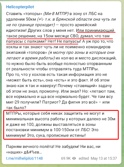 "Скорее всего, противник действовал своими силами ПВО из засады, заранее переброшенной в приграничную зону, из которой дистанция позволяла поразить нашу авиационную группу. Значит, противник, скорее всего, знал маршрут и время вылета нашей авиационной группы", - отмечает телеграм-канал.