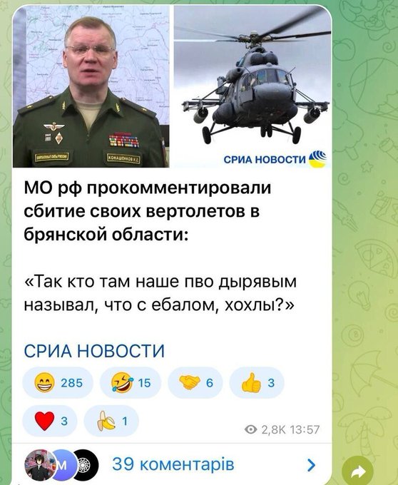 Большой российский телеграм-канал о войне "Повернутые на Z войне" сообщил, что авиационная группа россиян попала в засаду украинцев.