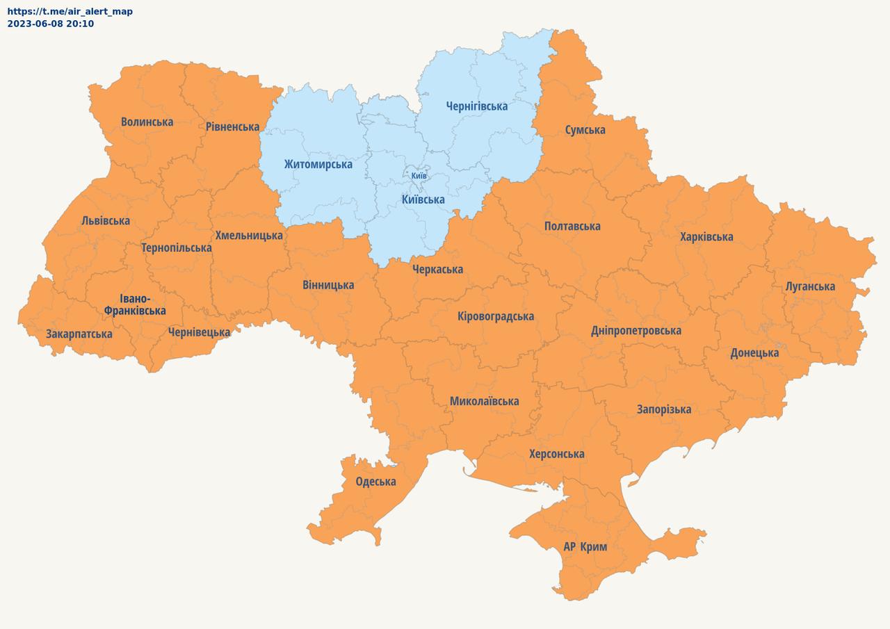 В Украине с 19:30 8 июня ширится воздушная тревога, которая началась с восточных областей и затем перекинулась на южные, центральные и западные регионы.