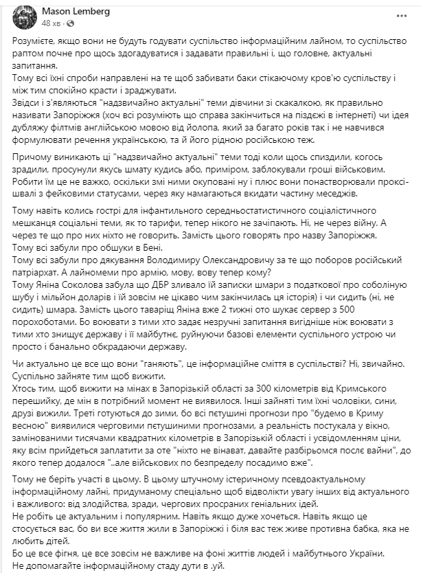 "Правительство у нас какое? Коллегиальный. Итак, Юлия Свириденко, Ольга Стефанишина, Александр Кубраков, Ирина Верещук, Михаил Федоров, Вадим Гутцайт, Оксен Лисовый, Виктор Ляшко, Сергей Марченко, Денис Малюська, Олег Немчинов, учтите позицию международных партнеров, профильных общественных организаций, просто здоровой логики. Потому как раз Вы и будете нести ответственность за провалы, которые допустит в должности нелегитимно избранная Елена Дума, которая на сегодняшний день имеет только 5 голосов. И протокол заседания, к слову, до сих пор не подписан. А именно это правовое основание обращения к Вам с целью назначения", - отмечает он.