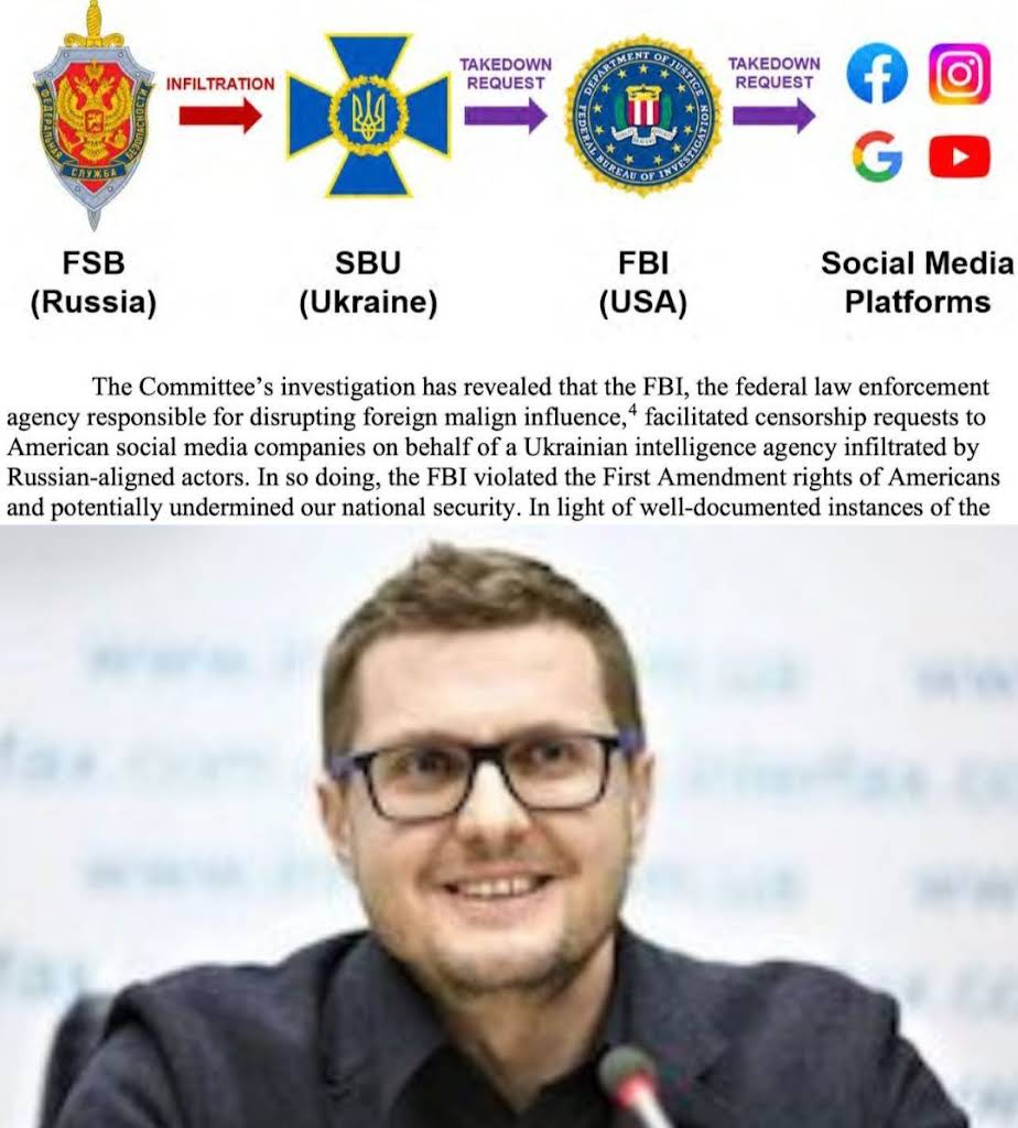 "Комітет з розслідування виявив, що ФБР відповідальні за злочинний іноземний вплив на цензуру американських соцмереж через російських агентів, які проникли в СБУ" (с)