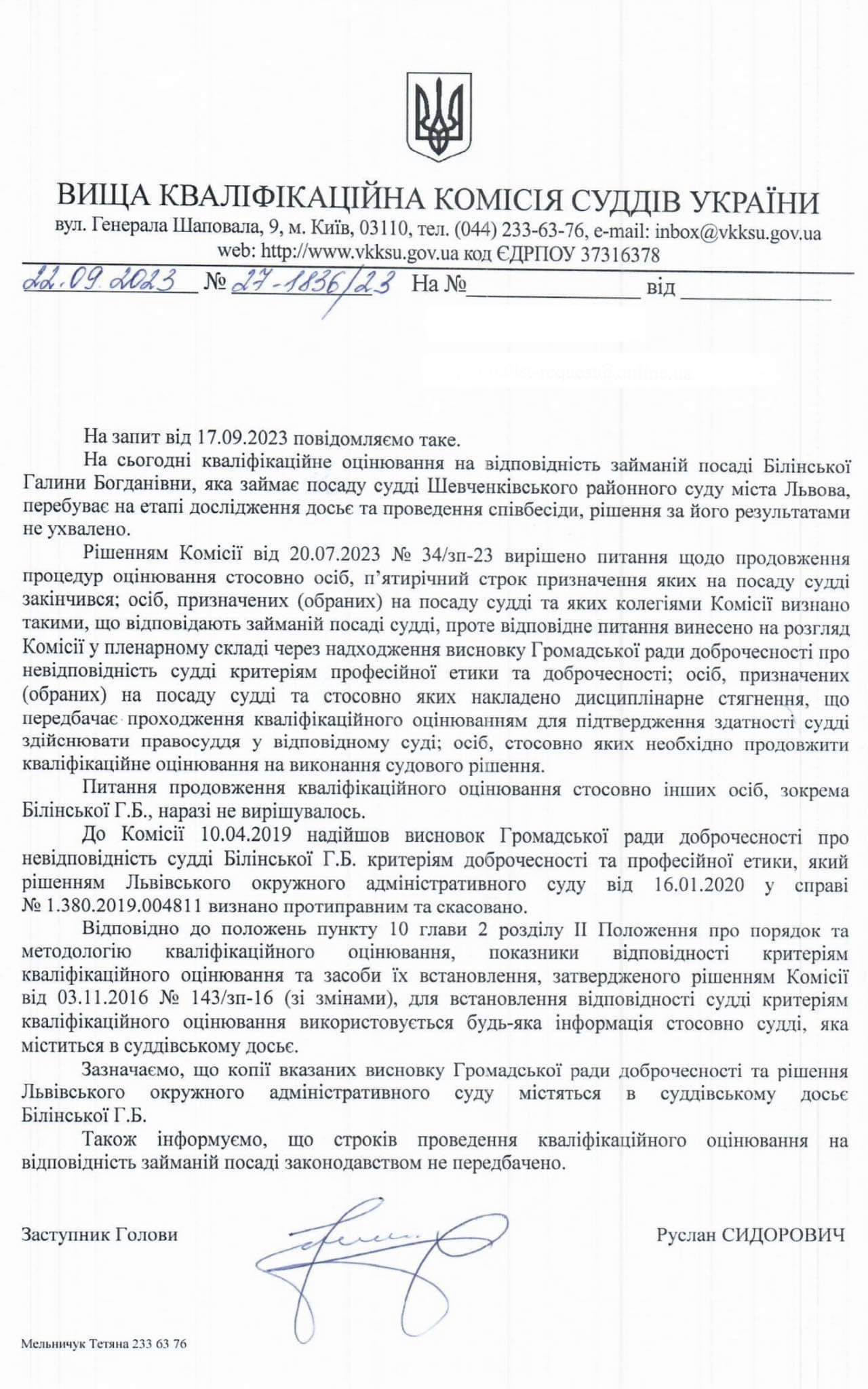 Высшая квалификационная комиссия судей начала второй этап оценивания председателя Шевченковского районного суда Львова Галины Билинской в начале сентября.