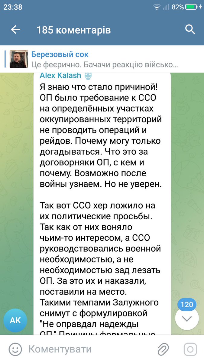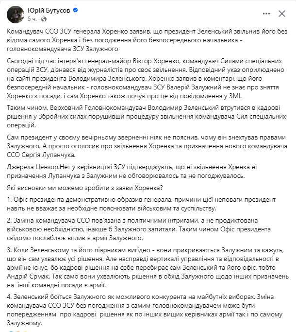 Хоренко отметил, что ССО работают на многих направлениях на линии фронта, планируют ряд операций, в том числе на Авдеевском направлении. По словам офицера, от Залужного он услышал, что вопросов или претензий к нему по выполнению боевых задач нет.