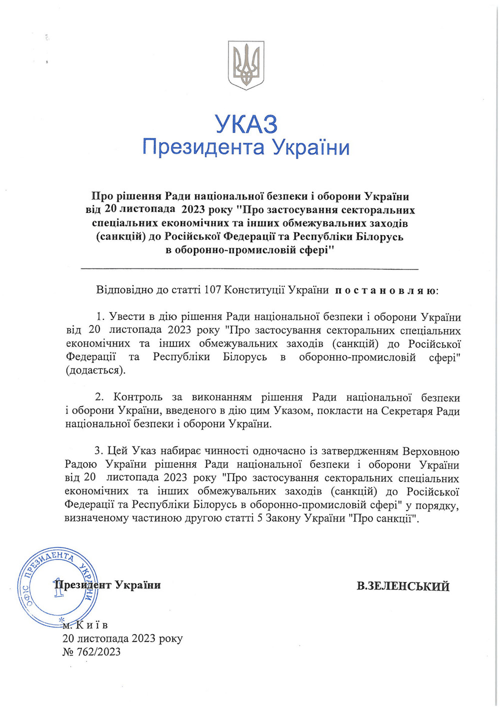 Владимир Зеленский внес в Верховную Раду проект постановления №10271 о введении секторальных специальных экономических и других ограничительных мер (санкций) в Россию и Республику Беларусь в оборонно-промышленной сфере на 50 лет. Постановлением депутаты должны утвердить соответствующее решение СНБО от 20 ноября.