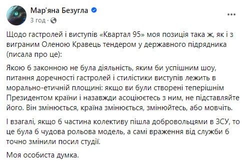 И все эти старания перечеркивали новые и новые интернет-вопли Бзуглой. Неожиданно открылось, что Безуглая подверженна определенной психической аномалии - она настолько болезненно обидчива, что обозлившись на кого-то, вообще перестает чувствовать границы дозволенного. Офис Ермака имел несчастье в этом убедиться. Буквально после жесткого разговора, где от Безуглой недвусмысмысленно потребовали заткнуться, эта мадмуазель наехала на святая святых. На студию "Квартал 95". В горячке она даже не поняла что кинула камень в личный и любимый аквариум Владимира Зеленского. Смотрите здесь (линк) скан дикого поста Безуглой на Фейсбук.