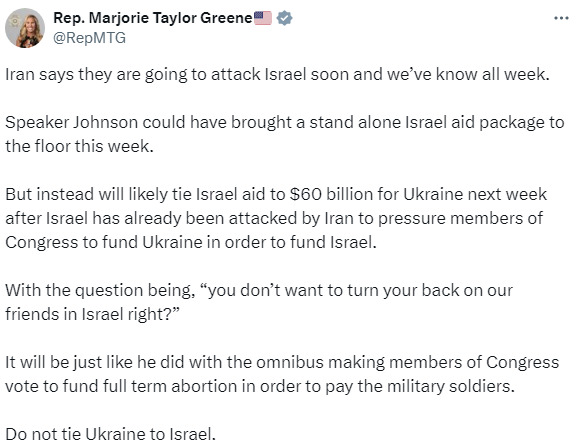 Выступающая против помощи Киеву Грин заявила, что на фоне угрозы удара по Израилю со стороны Ирана, спикер Джонсон мог бы вынести отдельный пакет помощи Еврейскому государству на рассмотрение уже на этой неделе, но тот якобы придерживается логики единого пакета.
