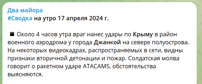 В городе Джанкой в районе военного аэродрома в ночь на 17 апреля прогремели взрывы.