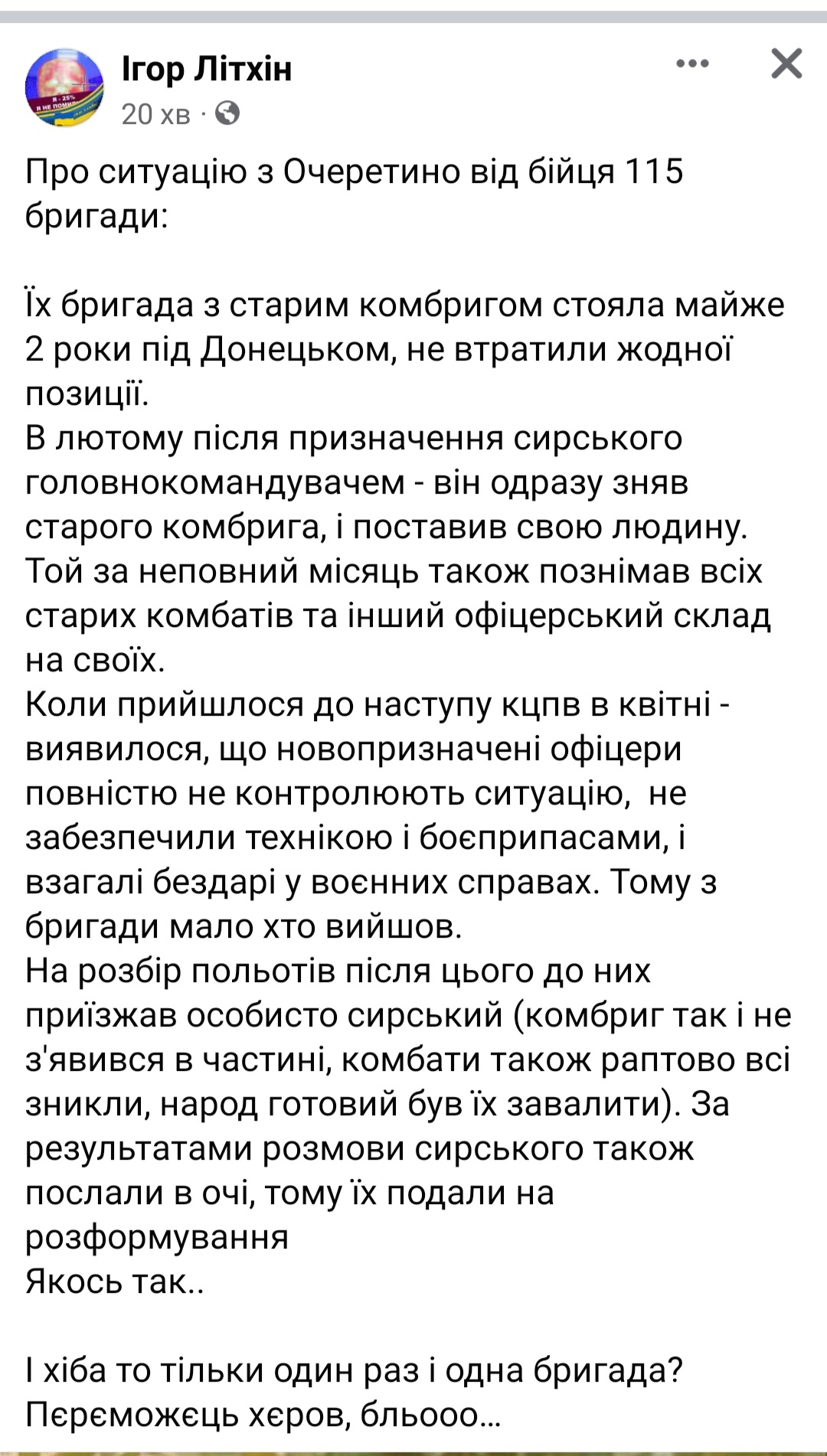 Положение истощенных украинских бригад в районе Очеретино отчаянное. То, что украинцы потеряют несколько сел вокруг оси в этом районе – это очевидный факт.