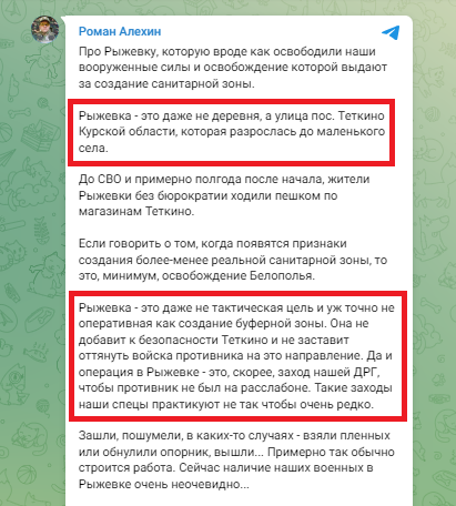 Зарко предполагает, что такое громкое заявление Кадырова о захвате Рыжевки всего за три дня является ответом на предыдущие заявления Российского добровольческого корпуса о контроле над селом Теткино в приграничье Курской области.