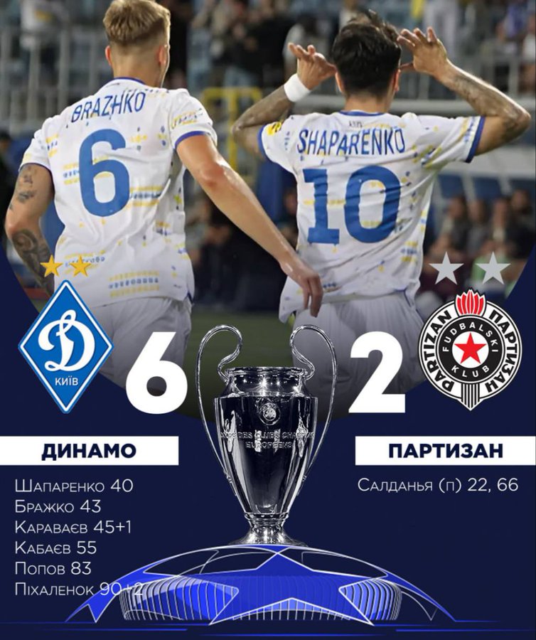 Киевское "Динамо" одержало победу над белградским "Партизаном" со счетом 6:2 во 2-м квалификационном раунде Лиги чемпионов.