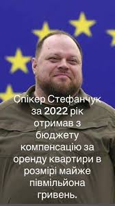 На дружину Стефанчука записана квартира площею 101,8 кв. м у Києві, вона також частково (50%) володіє квартирою площею 49,8 кв. м у смт Ярмолинці Хмельницької області. Крім цього, дружина голови Верховної Ради орендує в Києві гараж.