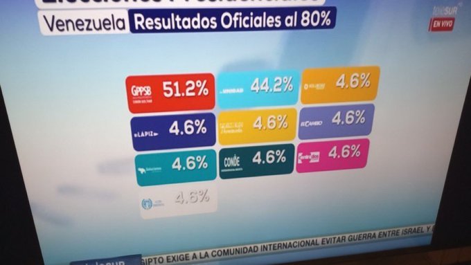 Он сказал, что избирательная комиссия объявила результаты голосования на основе 80% подсчитанных бюллетеней, тогда как венесуэльская оппозиция опубликовала совсем другие результаты.