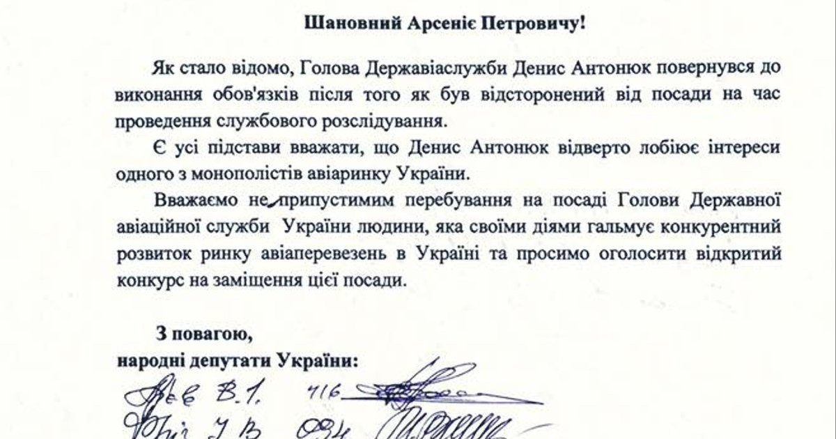 БПП просит Яценюка заменить скандально известного главу Госавиаслужбы Антонюка. ДОКУМЕНТ