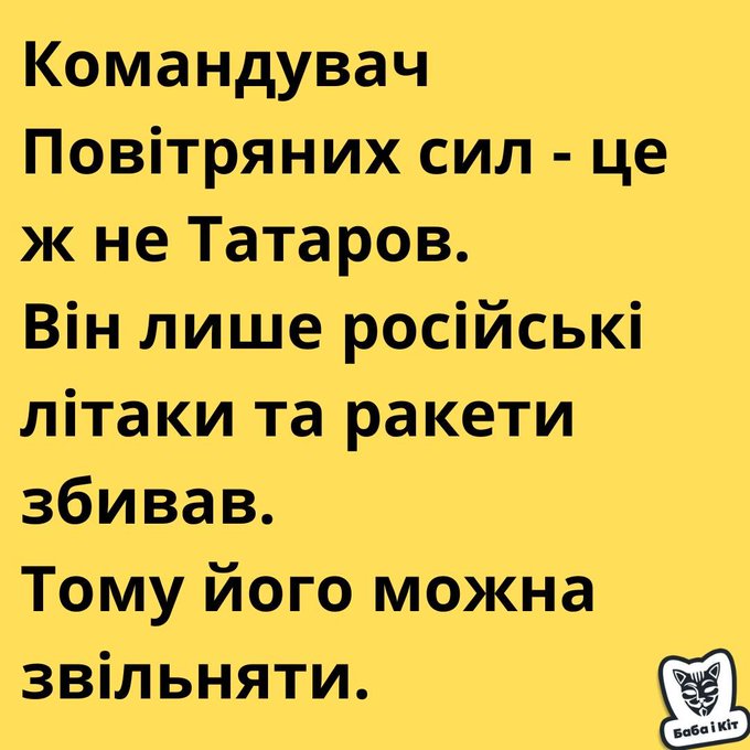 Ігната зняли з посади коли той сказав, що рашка на нас би не напала, якби у нас були свої ракети, а Олешука зняли, бо той сказав, що безумною пора вже зайнятися СБУ, Пристайка усунули, бо він сказав не час сперечатися з нашими головними партнерами, а от татаров на місці ну і всі решта негідників