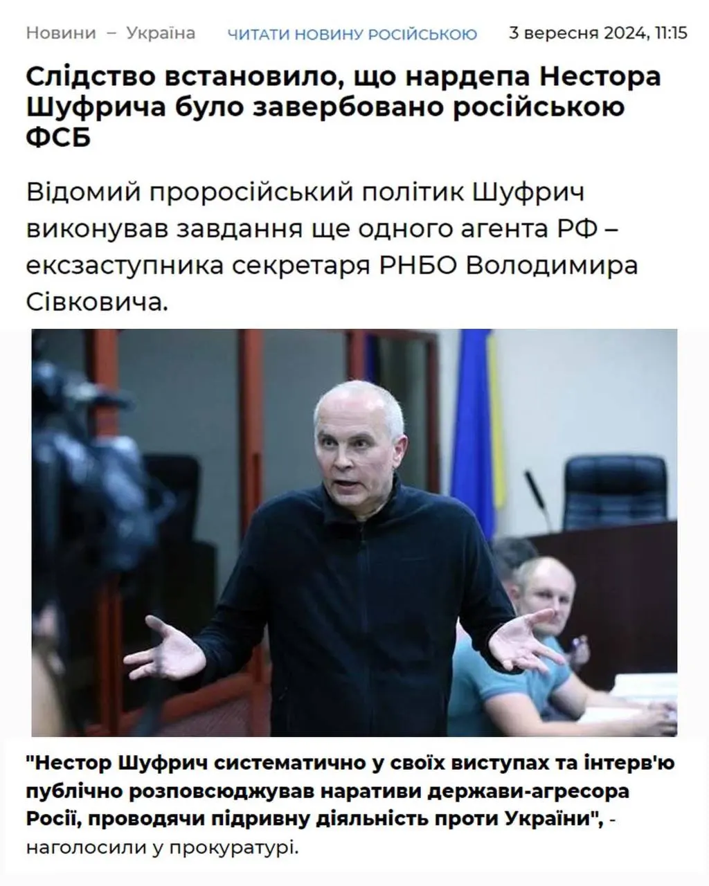 Напомним, что Шуфрича и его помощника будут судить за финансирование Росгвардии в оккупированном Крыму. Ранее экс-нардеп от запретной "Оппозиционной платформы – За жизнь" Нестор Шуфрич получил подозрение в государственной измене. По данным следствия, он тесно сотрудничал и выполнял задачи бывшего секретаря СНБО Владимира Сивковича, агента ФСБ, задачей которого была координация российской агентуры в Украине.