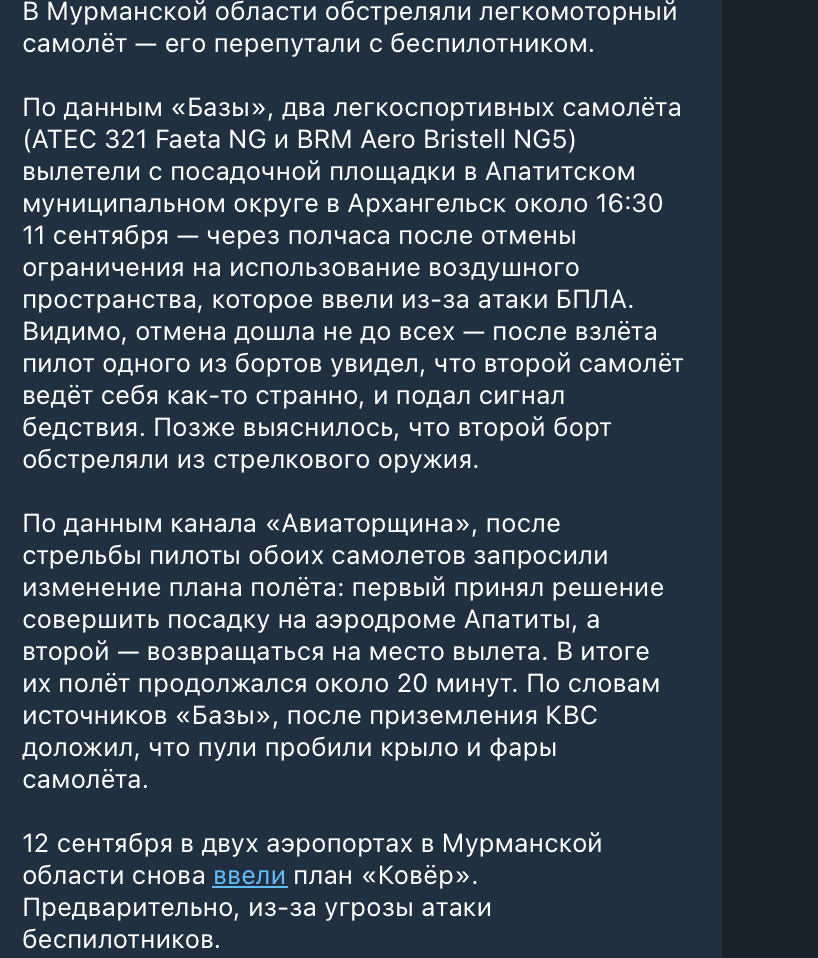 В Мурманской области россияне перепутали свой легкомоторный самолет с дроном и обстреляли его из стрелкового оружия.
