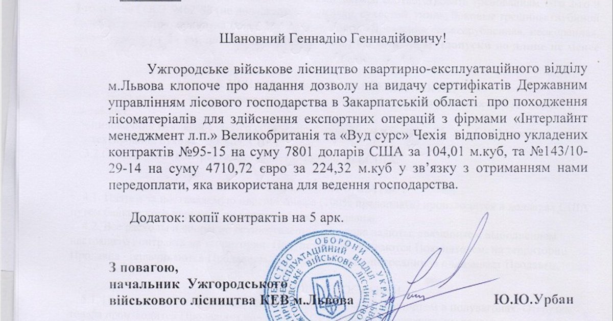 В сообщении опубликовал скан ходатайства за подписью начальника Ужгородского военного лесничества Юрия Урбана. В документе Москаля просят предоставить разрешение на выдачу сертификатов о происхождении лесоматериалов "для совершения экспортных операций с фирмами Интерлайнт менеджмент (Великобритания) и Вуд сурс (Чехия) в соответствии с заключенными контрактами №95-15 на сумму 7801 долларов США за 104,01 куб. м и №143/10-29-14 на сумму 4710,72 евро за 224,32 куб. м".