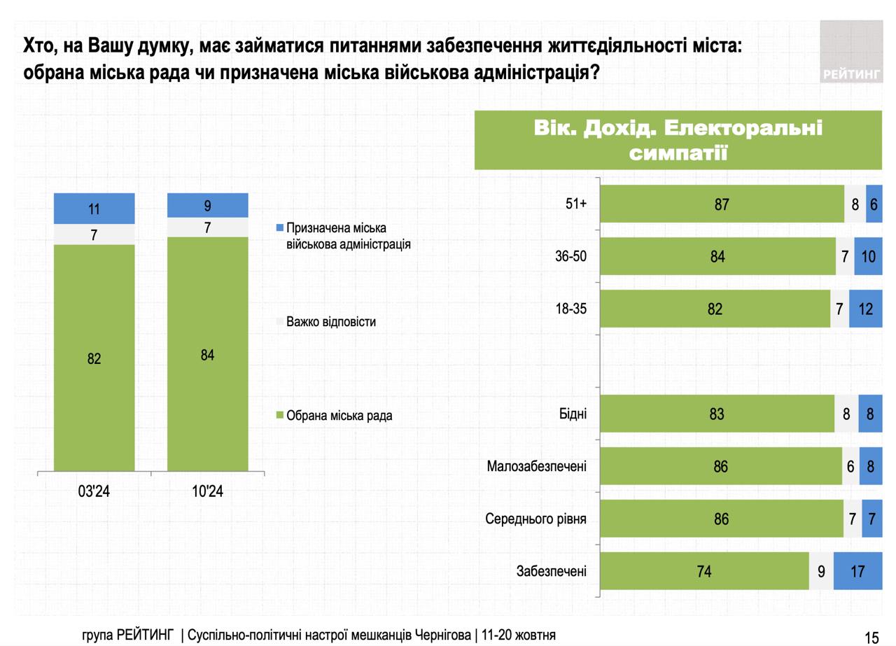 Подавляющее большинство черниговцев считают, что военная администрация в Чернигове должна быть ликвидирована (71%), а вопросами жизнеобеспечения города должен полностью заниматься избранный городской совет (84%).
