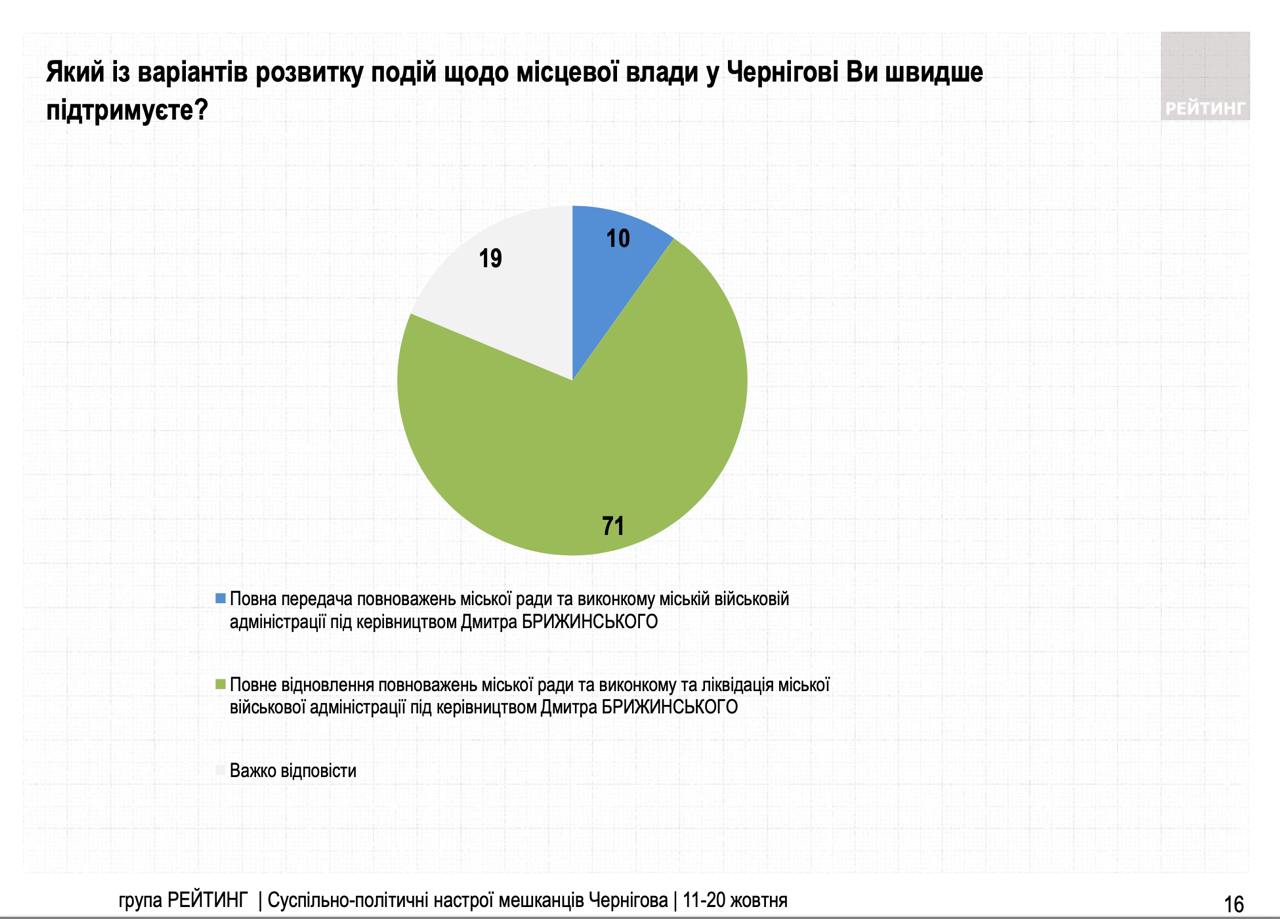 В то же время 60% респондентов назвали Черниговскую городскую военную администрацию неэффективной и 64% заявили, что деятельность ее руководителя Дмитрия Брижинского препятствует развитию города. Деятельность областной военной администрации считают вредной для Чернигова 58% горожан.