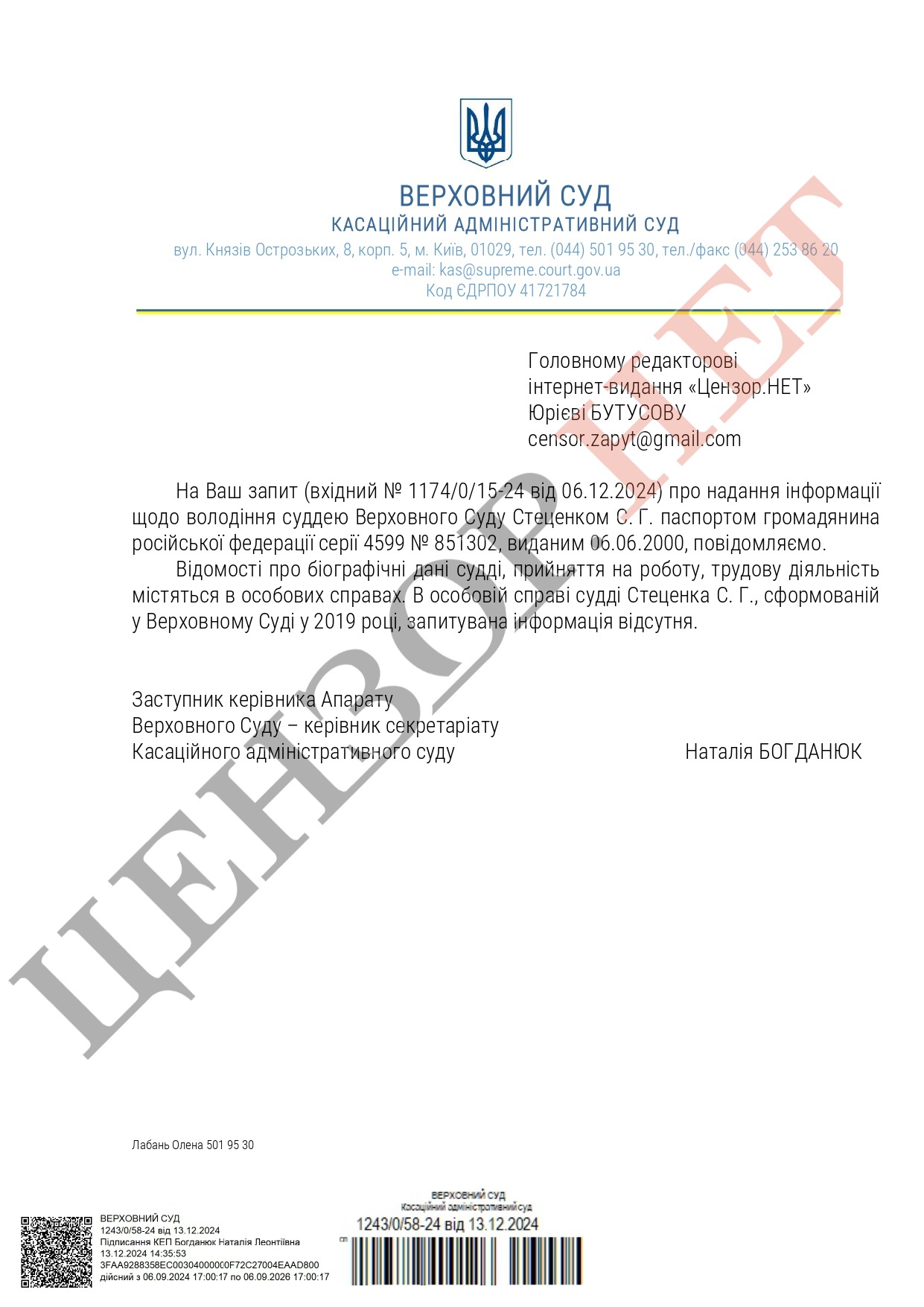 В Верховном Суде ответили, есть ли у судьи Стеценко гражданство РФ: информация отсутствует. ДОКУМЕНТ