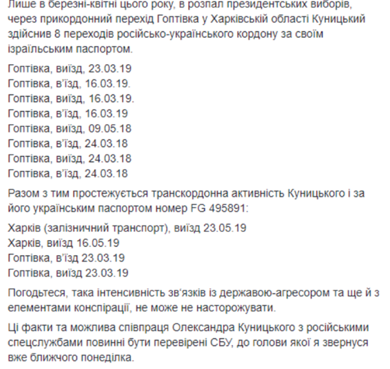 "Відмітки в паспортах Олександра Куницького також свідчать, що він тільки весною 2019 роки 8 разів перетинав російсько-український кордон в прикордонному пункті пропуску «Гоптівка» за ізраїльським паспортом і кілька разів за українським (номер паспорта FG 495891).