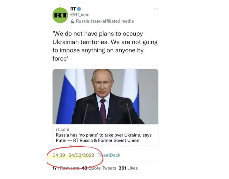 «У нас нет планов оккупировать украинские территории. Мы не собираемся никому ничего навязывать силой» - 2022г.