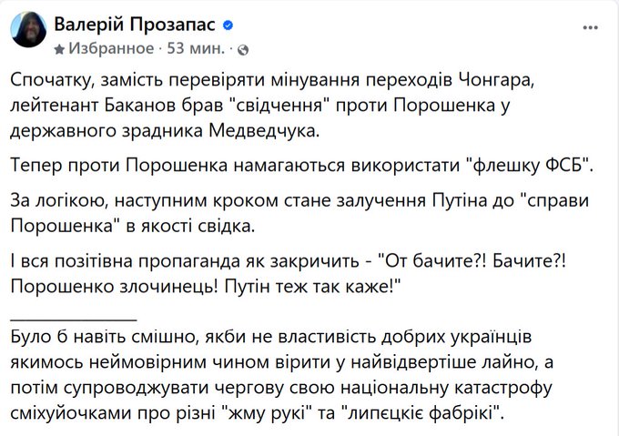 "Последние дни ГБР и Офис Генерального прокурора начали беспрецедентную кампанию взятия в заложники бывших работников УГО. Бывший заместитель генерала Федорова уже находится под стражей с космическим залогом 401 миллион гривен. Сегодня еще одного офицера УГО, который работал под руководством генерала Федорова, тоже взяли под стражу с аналогичным залогом 400 миллионов гривен. Такие цифры залога, которые суды не назначают ни убийцам, ни расхитителям государственной собственности, свидетельствуют о том, что людей действительно берут в заложники с единственной целью - заставить дать клеветнические лживые показания против Петра Порошенко, лидера оппозиции, пятого Президента Украины", - пояснил адвокат.