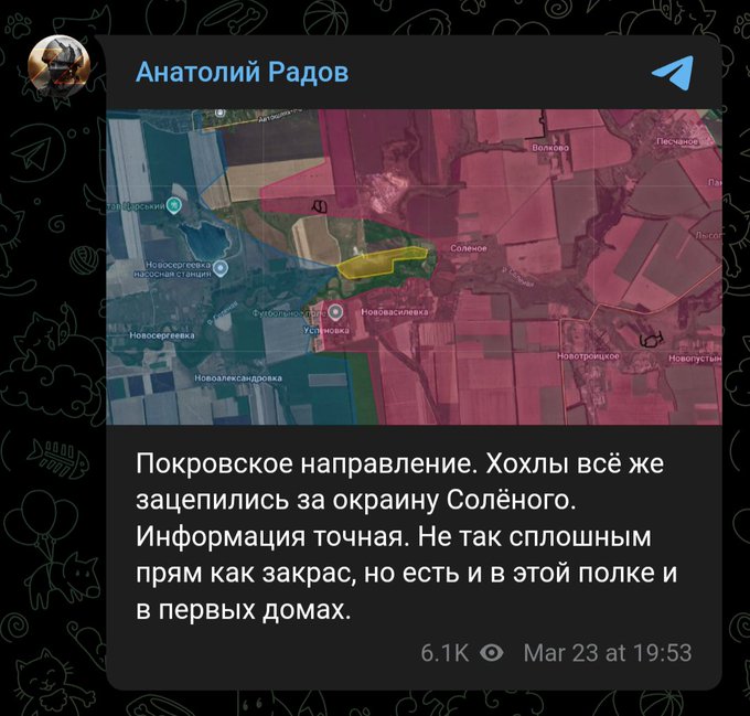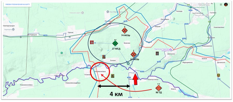 "Покровск. 90-я танкова дивізія орків , яка зав'язла в боях під Преображенкою , раптом відчула, що "пахнет жареним". З падінням Нововасилівки , накривєется "мідним тазом" все міжрічінське угруповання на напрямку удару в обхід Покровська , що складається з 27 мотострілкової дивізії і пари бригад ЦВО.