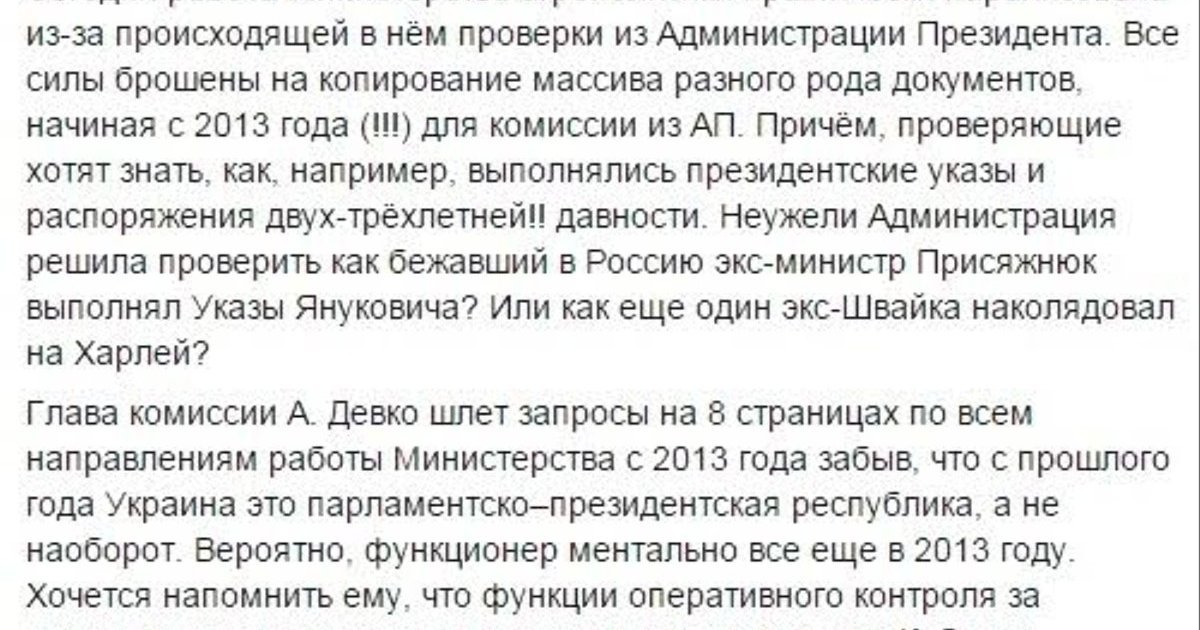 Об этом экономический эксперт, волонтер, внештатный советник министра Алексей Зубрицкий написал на странице Facebook.Он отметил, что проверяющие действуют "по принципам и методам времен Януковича" запрашивают устаревшую и неактуальную информацию, например - о выполнении президентских указов 2-3-летней давности. "Все силы брошены на копирование массива разного рода документов, начиная с 2013 года (!!!) для комиссии из АП. Неужели Администрация решила проверить, как бежавший в Россию экс-министр Присяжнюк выполнял Указы Януковича? Или как еще один экс-Швайка "наколядовал" на Харлей?", - возмутился Алексей Зубрицкий, добавив, что глава комиссии Андрей Девко направляет министерству запросы буквально по каждому направлению деятельности объемом 8 страниц.