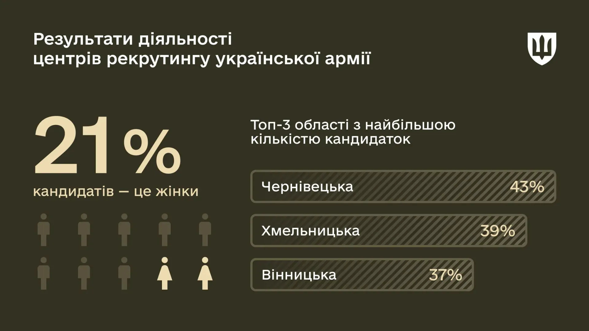 Доля женщин, обратившихся в центры рекрутинга, осталась неизменной и составляет 21% от общего количества предоставленных консультаций. Наиболее активно военной службой интересуются жительницы Черновицкой (доля 43%), Хмельницкой (39%) и Винницкой (37%) областей.