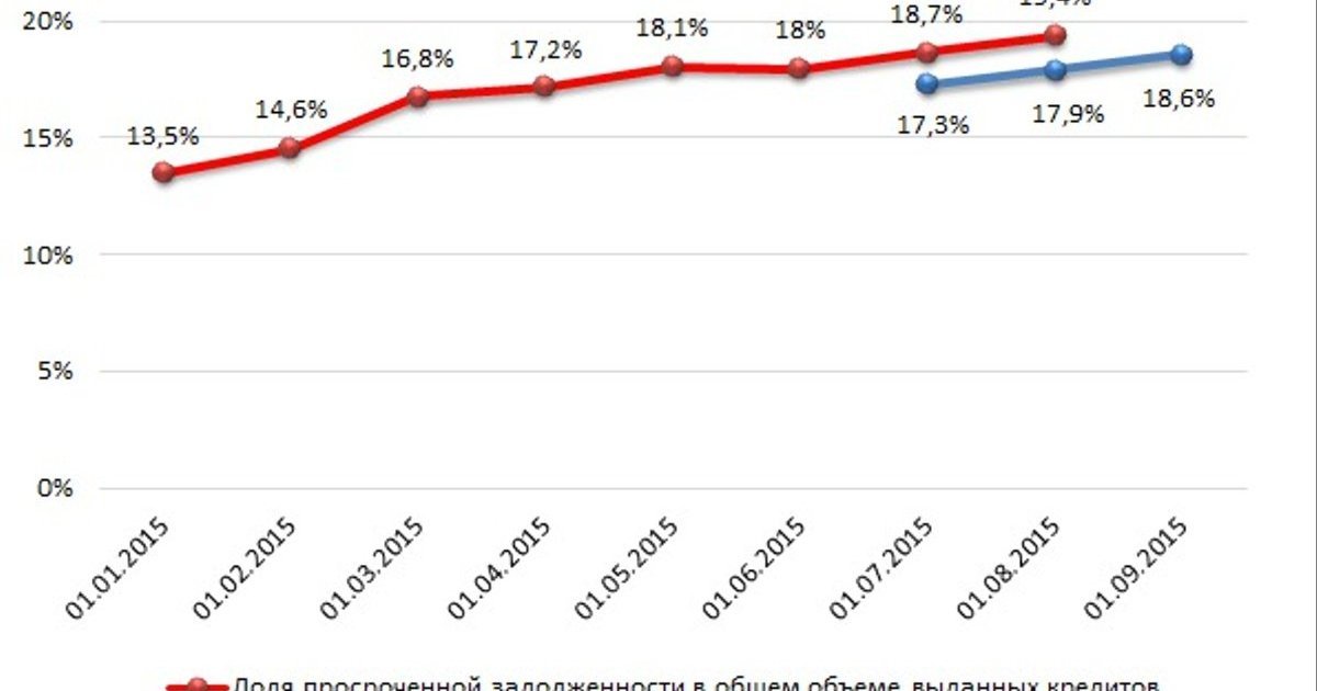 Доля просроченной задолженности в кредитном портфеле украинских банков (без учета неплатежеспособных) выросла в августе 2015 года на 0,7 процентного пункта и составила на 1 сентября 18,6%.