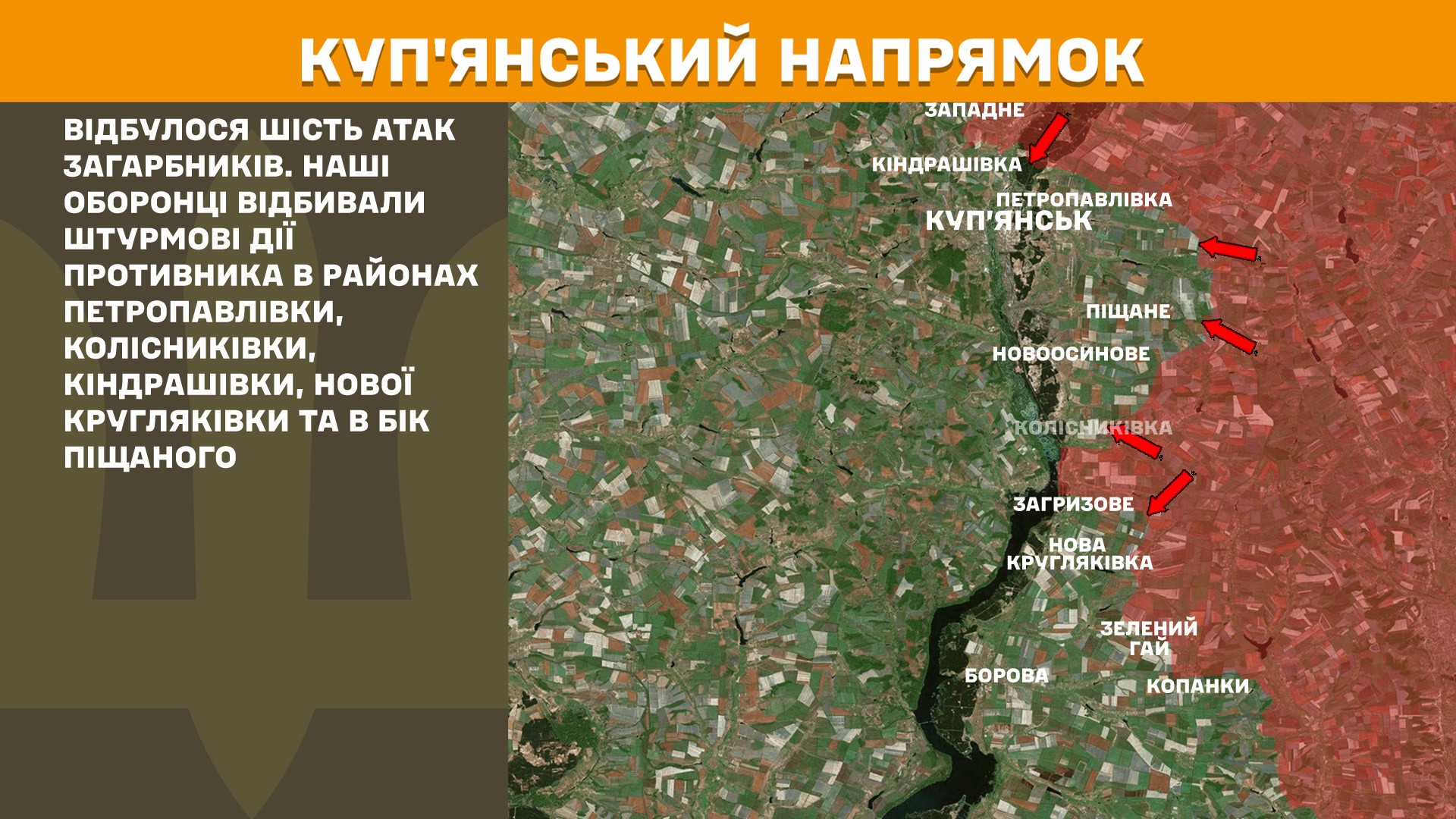 На Купянском направлении вчера состоялось шесть атак захватчиков. Наши защитники отражали штурмовые действия противника в районах Петропавловки, Колесниковки, Кондрашовки, Новой Кругляковки и в сторону Песчаного.