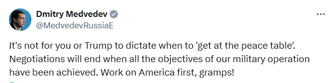 "Не тебе или Трампу диктовать, когда "садиться за стол мирных переговоров". Переговоры завершатся, когда будут достигнуты все цели нашей военной операции. Работай над Америкой сначала, дедушка!" - ответил ему Медведев.