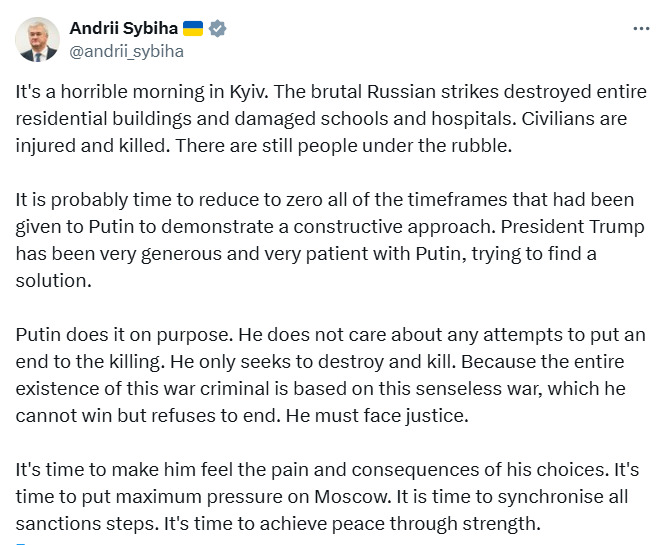 Глава МИД Украины Андрей Сибига, комментируя обстрел Киева войсками РФ, призвал сократить до нуля все временные рамки, предоставленные Путину для демонстрации конструктивного подхода.