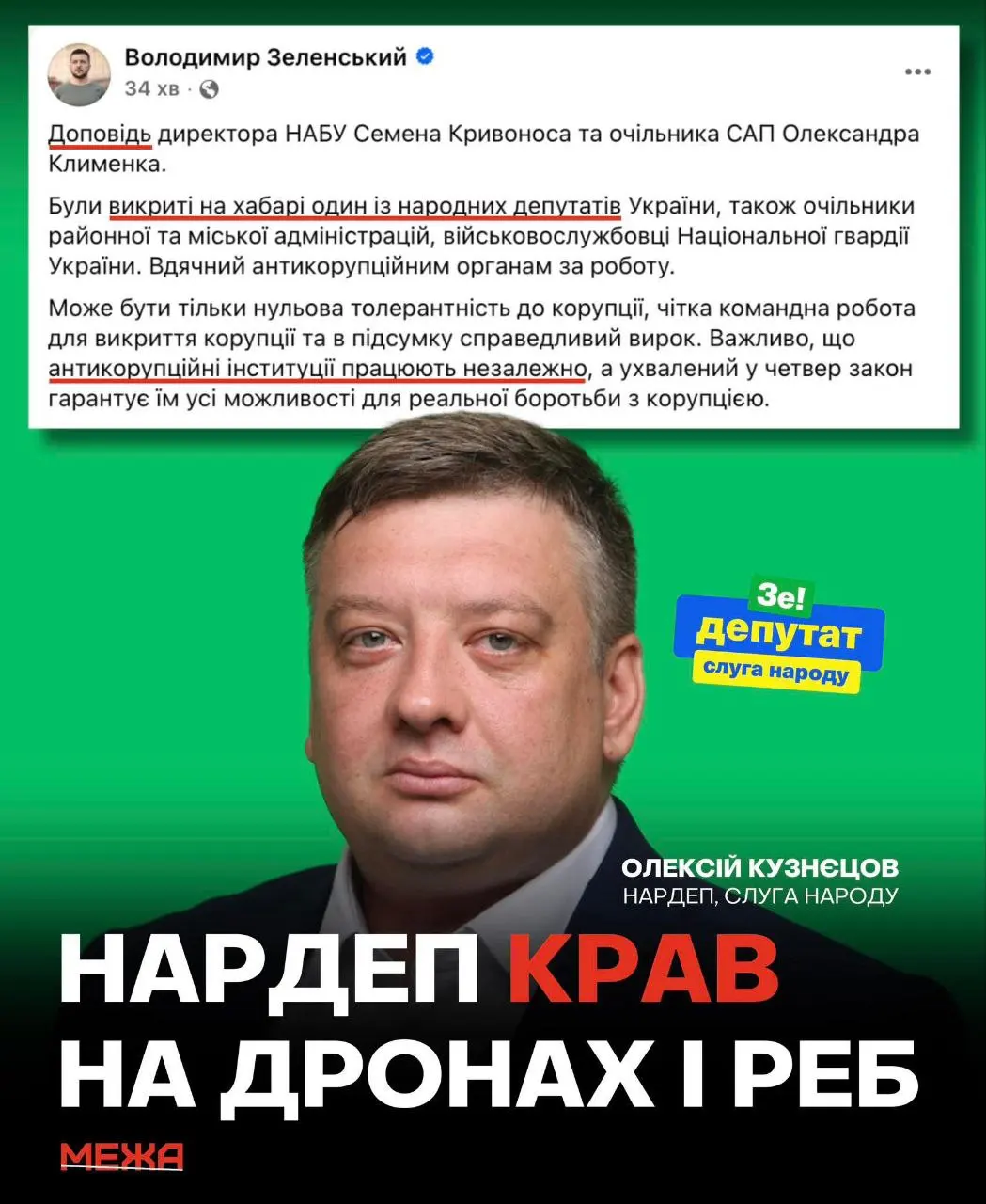 Володимире Зеленський, те, що вашого нардепа Кузнєцова нині зловили НАБУ, бо він крав на дронах і РЕБах - то це сталось лише тому, що українцям вдалося відбити у вас НАБУ і САП.