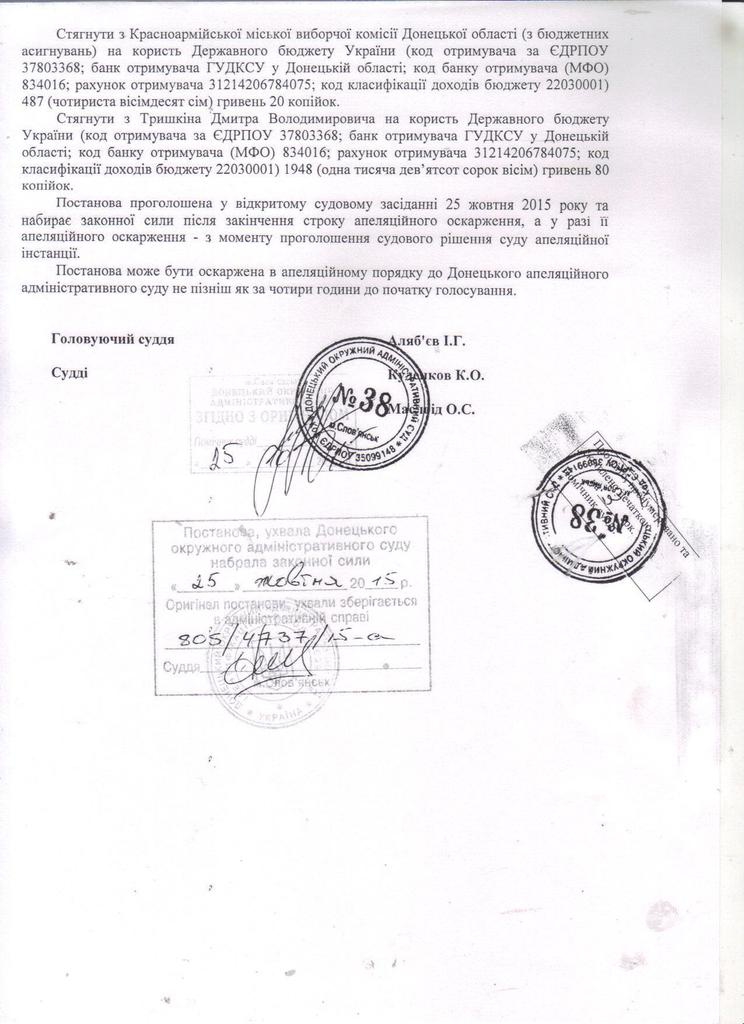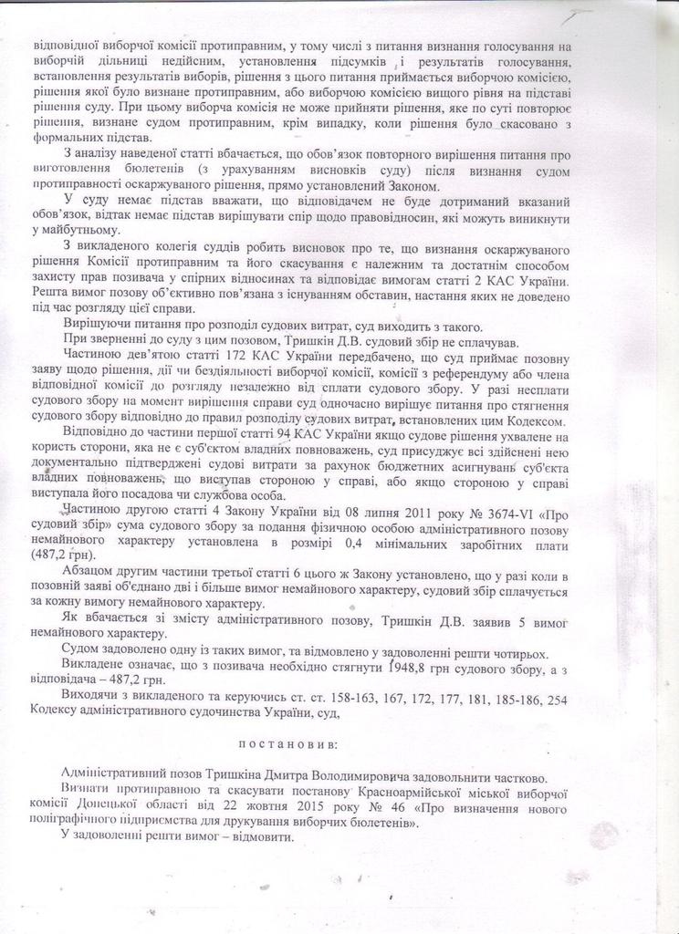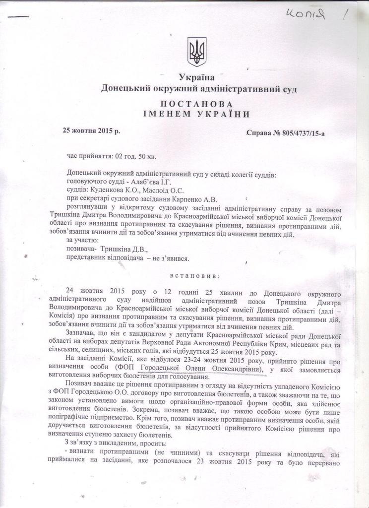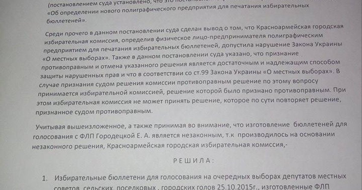 Донецкий окружной административный суд решил отменить Постановление Красноармейской городской избирательной комиссии о печати бюллетеней у физического-лица предпринимателя.