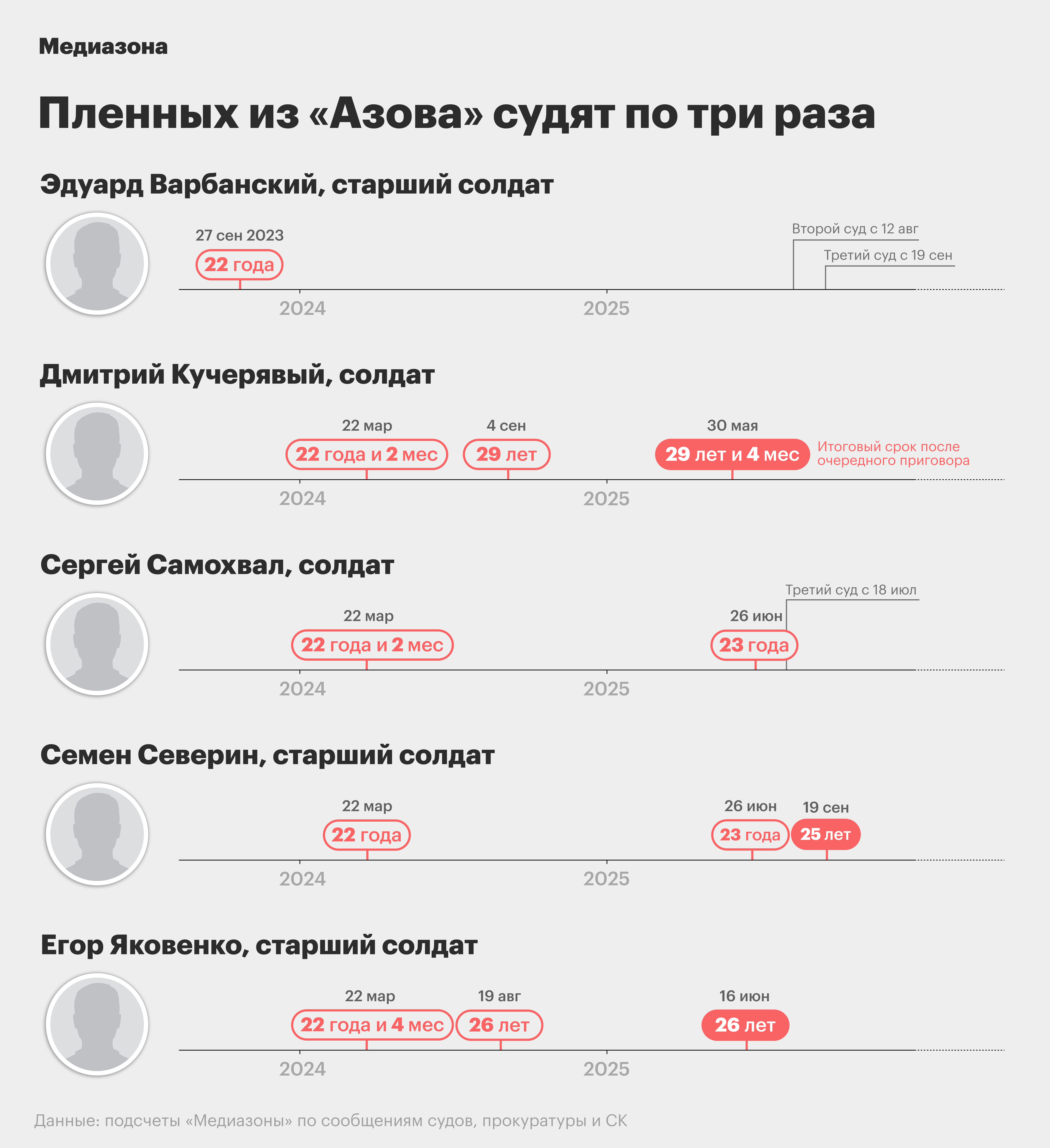 Кроме того, "Медиазона" насчитала шесть повторных заочных процессов. Как минимум двум военнослужащим ВСУ российские суды вынесли по два заочных приговора после того, как они вернулись из плена по обмену.