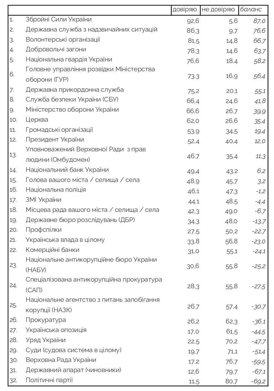 Самые низкие показатели получили политические институты: Верховная Рада - 17,2% доверия, государственный аппарат - 12,6%, политические партии - 11,5%. Доверие к правительству составляет 22,5%, тогда как 70,2% граждан ему не доверяют.