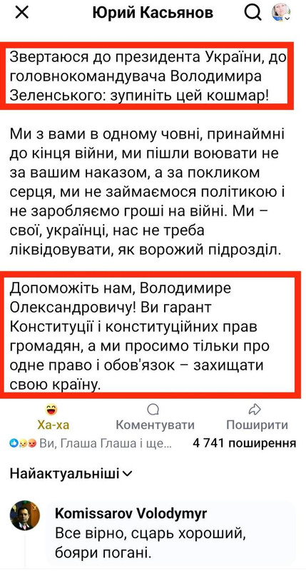 Напомним, Касьянов ранее сообщил, что успешное военное подразделение пустили под нож топ-коррупции и ликвидировали по приказу Ермака после критики в его адрес. Со стороны главы ОП, по словам Касьянова, идет давление и преследование. Кроме того, он отмечал, что бойцов подразделения "таскают" на допрос в службу Внутренней безопасности и на полиграф. Военный обратился с предупреждением к руководителю Офиса Президента Андрею Ермаку и призвал прекратить давление.